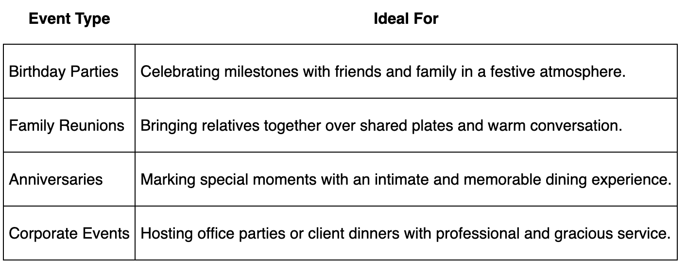 With spaces available for private dining, you can host unforgettable celebrations whether it's a birthday, reunion, or simply a gathering of loved ones.